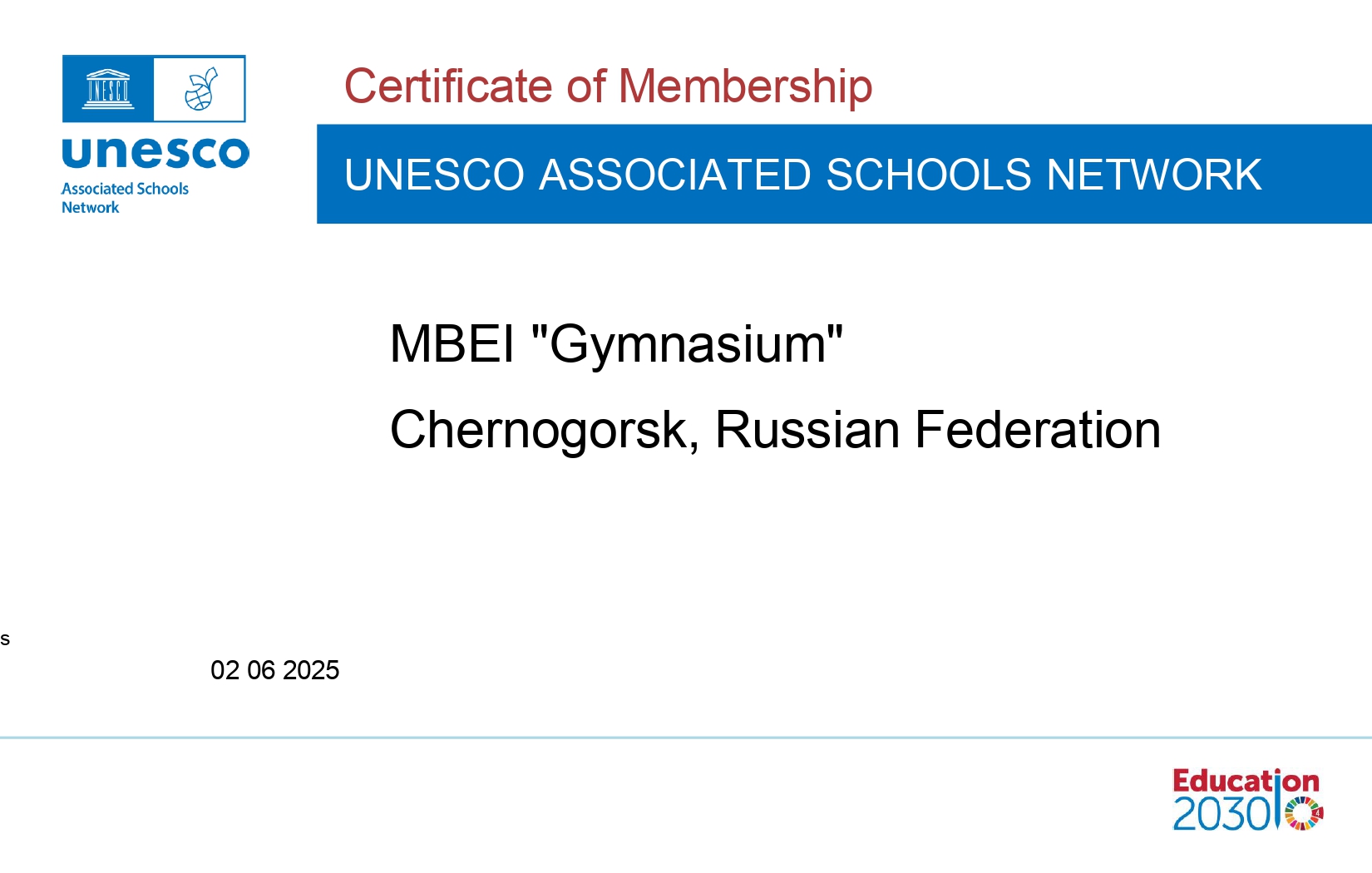 В июне 2025 года гимназия города Черногорска получила долгожданный международный сертификат, официально подтверждающий членство в сети «Ассоциированные школы ЮНЕСКО». (Ассоциированные школы ЮНЕСКО – это учебно – воспитательные учреждения, сотрудничающие с ЮНЕСКО в рамках соответствующих национальных программ в распространении миротворческих идей, нравственных и духовных ценностей).