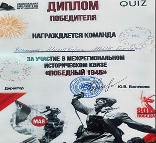 С библиотеками города гимназия имеет давние связи. 25 февраля в центральной городской библиотеке имени А. С. Пушкина прошёл Республиканский исторический квиз «Победный 1945 год!», посвященный 80-летию со Дня Победы в Великой Отечественной войне, в котором приняли ученики 9-х классов нашей школы, занявшие 1 место